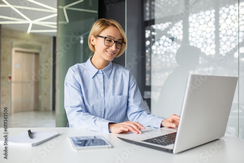 Friendly blonde worker sitting at a desk in the office, working on a laptop, smiling and looking at the screen.