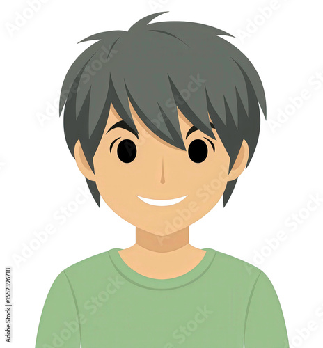 Friendly cartoon character with short hair and green shirt showcasing a warm smile, ideal for various creative projects and digital content needs.