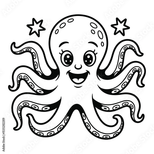 Friendly cartoon octopus character smiling with stars, black and white vector illustration, isolated on white for design and decoration projects