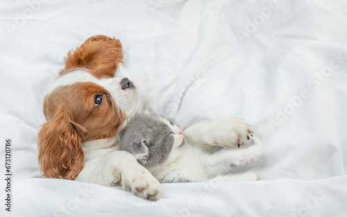 Friendly Cavalier King Charles Spaniel sleeps with tiny kitten on the bed at home. Top down view. Empty space for text