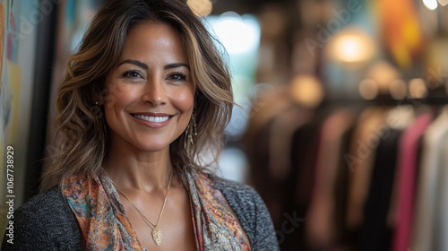 Friendly Hispanic female clothing store consultant smiles warmly in a boutique during the day