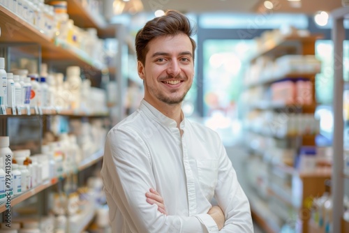 Friendly Male Pharmacist with a Welcoming Smile in Retail Pharmacy - Professional Healthcare Service and Customer Care