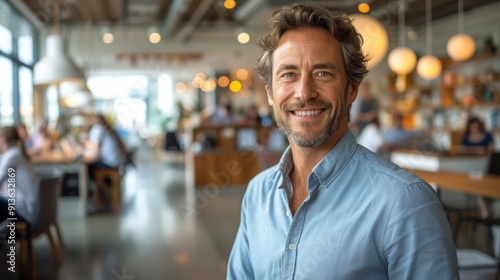 Friendly Man Smiling in Modern Cafe During Daytime With Customers in Background