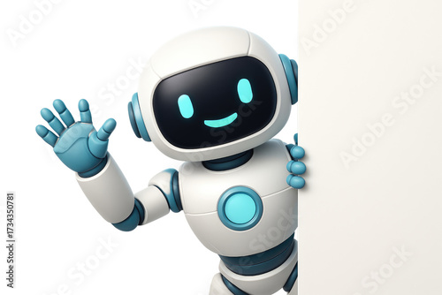 Friendly Robot Waving and Peeking from Behind a White Surface graphic design isolated on a transparent background