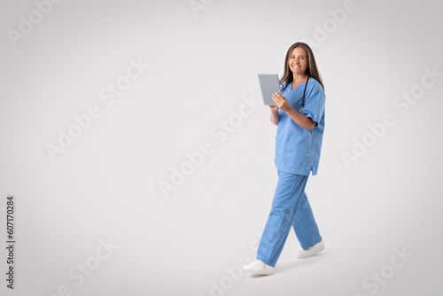 Friendly senior woman in medical uniform holding digital tablet, walking on grey background, full length, free space
