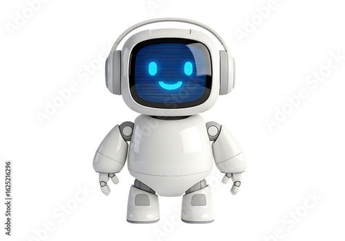 Friendly White Robot with Headphones, Smiling Digital Face, 3D Render, Technology Concept
