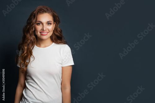Friendly woman wearing white t-shirt