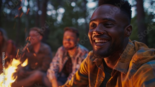 Friends are gathered around a crackling campfire, their laughter and warmth creating a vibrant autumn atmosphere.