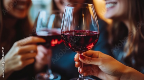 Friends celebrate with wine glasses raised, enjoying laughter and connection in a warm, cozy atmosphere.