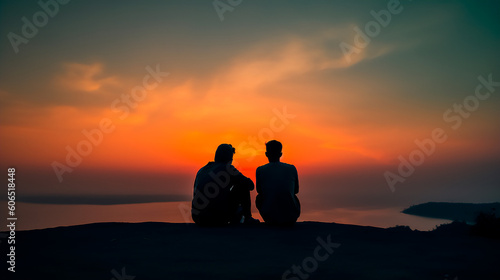 Friends contemplating the sunrise in a beautiful landscape. Generative AI