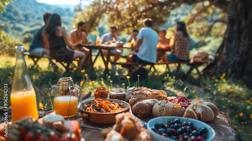 Friends enjoy a picnic lunch in the outdoors with a spread of delicious food and drinks.