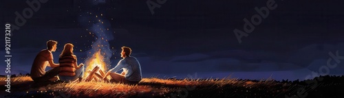 Friends enjoying a bonfire, night laughter, Watercolor style
