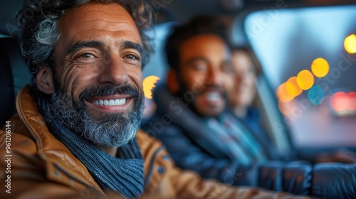 Friends enjoying a joyful car ride through a city at dusk, illuminated by warm streetlights and vibrant surroundings. Generative AI