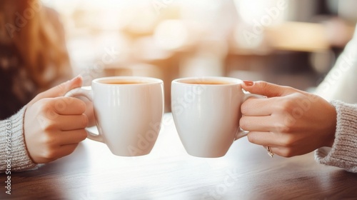 Friends enjoying a warm coffee chat in a cozy café during a sunny afternoon