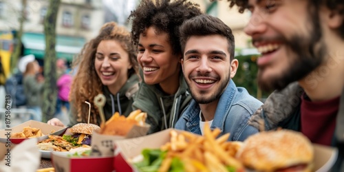 Friends enjoying lunch on a patio, laughing and talking, sharing food and drinks in a lively setting.