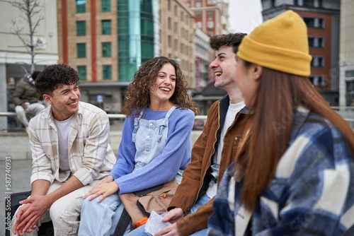 Friends from different cultures laughing and resting on a bench after arriving in Spain for a vacation.