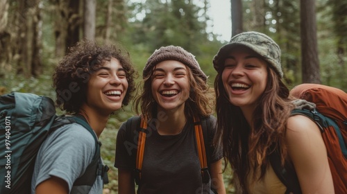 Friends having fun during a forest hike, capturing candid moments of joy and friendship