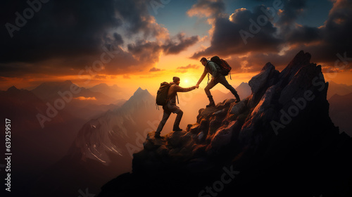 friends helping each other on mountain to reach the top, Generative Ai illustration