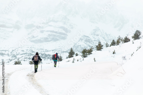 Friends hiking in snowy Pyrenees mountains with trekking poles