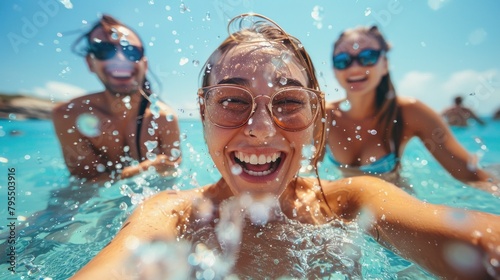 Friends in swimwear are playfully splashing water at each other, having fun in the sea on a sunny day