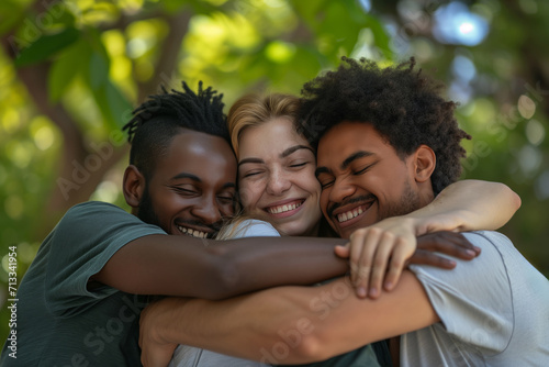 Friends Of Diverse Backgrounds Embrace In Park, United In Charitable Efforts