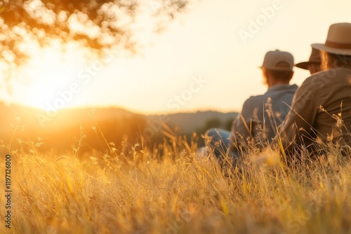Friends relax and enjoy sunset together in a peaceful grassy field on a warm evening