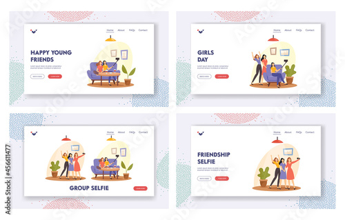 Friends Selfie Landing Page Template Set. Happy Girls Company Having Fun Photographing on Smartphone. Girlfriends Relax