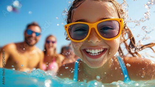 Friends splash in the ocean while a girl smiles brightly in the sun
