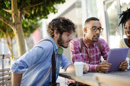 Friends talking at sidewalk cafe