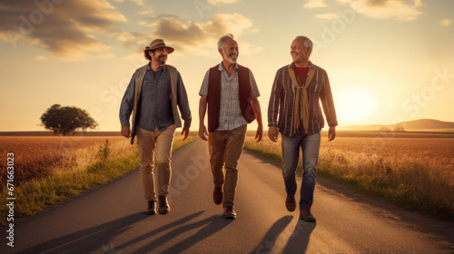 Friends, walking in nature on country road with beautiful desert view of the sky. Vacation, summer and walk people group outdoor for a trip or holiday. Meeting of friends, farmers returning home.
