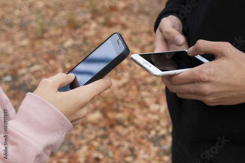 friends with a mobile phone in the fall outdoors
