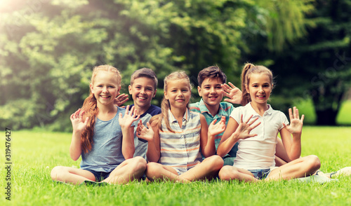 friendship, childhood, leisure and people concept - group of happy kids or friends waving hands in summer park