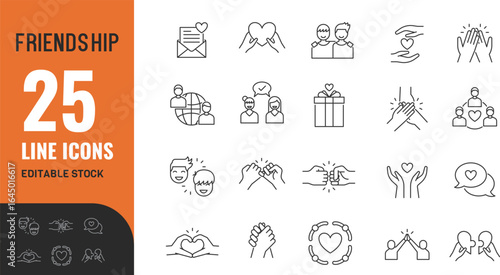 Friendship line editable icon set. Relationship, connection, support, help, care, trust, loyalty, happy, fun, social, community, diverse, group, team. Vector illustration.