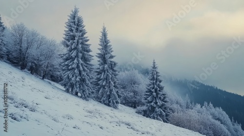 Frigid firs, snowy hilltop, Carpathian clouds.