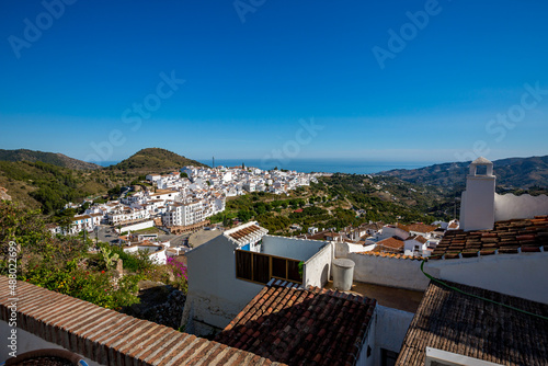 Frigiliana, Malaga, Spain. Sunny spring day street travel view. Elevated panoramic perspective.