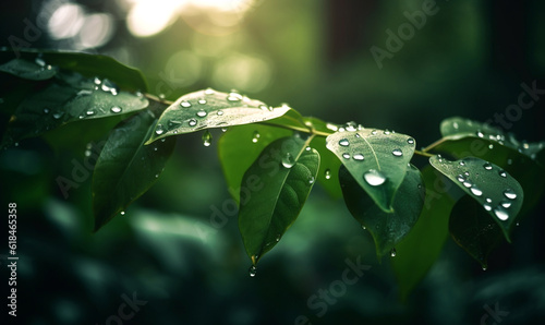 frische grüne Blätter mit Tautropfen, generative AI