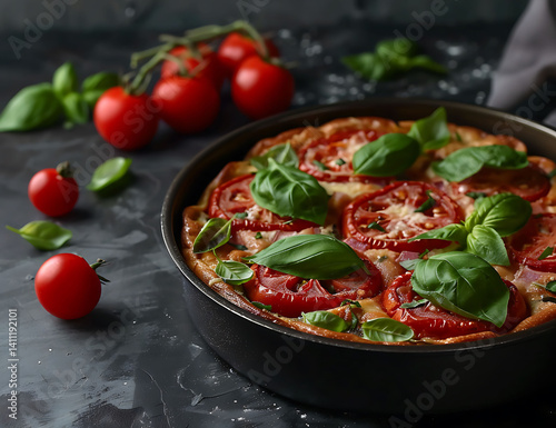 Frittata with tomatoes, basil, and cheese in a black pan on a dark concrete background. Fresh egg dish with a vegetable omelet or frittata for a healthy meal. Food photo on an isolated background.