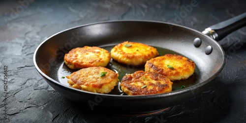 Fritters frying on a sizzling hot non-stick frying pan, fritters, frying, hot, sizzling, non-stick, pan, oil, crispy
