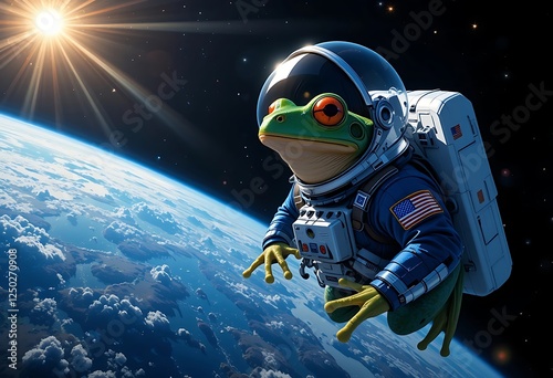Frog Astronaut Floating in Space Above Earth with Starry Background