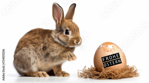 Frohe Ostern Konzept Feiertag Grußkarte mit deutschem Text - Süßer kleiner Osterhase, Kaninchen sitzt in einem Osternest mit Osterei auf Tisch, isoliert auf weissem Hintergrund