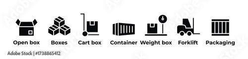 From Open Boxes to Forklifts Icons set vector illustration glyph with Open box, Boxes, Cart box, Container, Weight box, Forklift, Packaging
