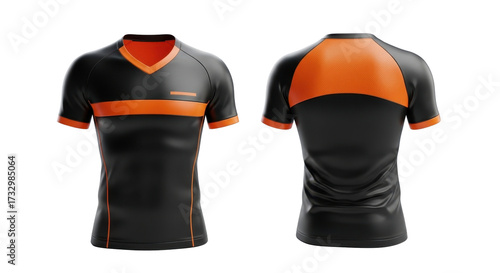 Front and back view of a black and orange athletic t-shirt with a V-neck collar, isolated on a white background.