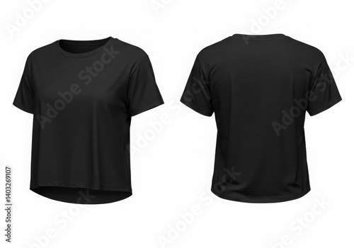 Front and back view of a black short sleeved t shirt on a white background for product display