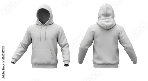 Front and Back View of a Gray Hoodie with Drawstrings and a Kangaroo Pocket.