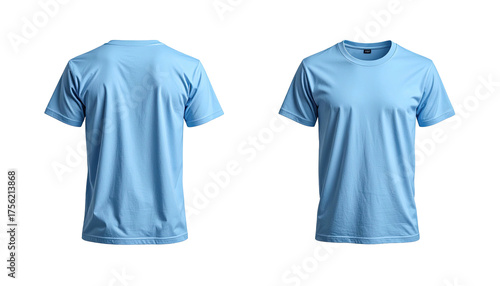 Front and back view of a light blue crew neck t-shirt on a transparent background