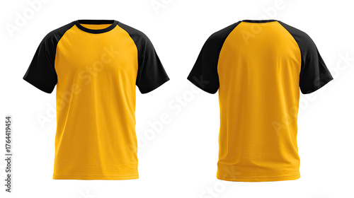 Front and back view of a mustard yellow t-shirt with black raglan sleeves