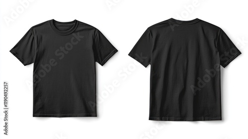 Front and back view of a plain black t-shirt isolated on white.