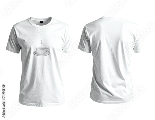 Front and back view of a plain white t-shirt with a simple coffee cup graphic