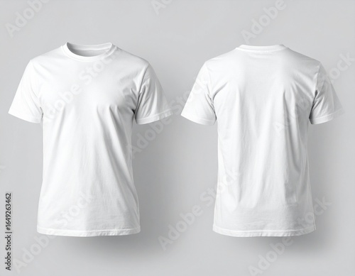 Front and Back View of Blank White T-Shirts on Gray Background.