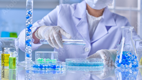 Front angle shot photography in modern lab scene with a profession scientist is conducting an chemical experiment with hydrogel balls. Advertising template for design, blank space for text
